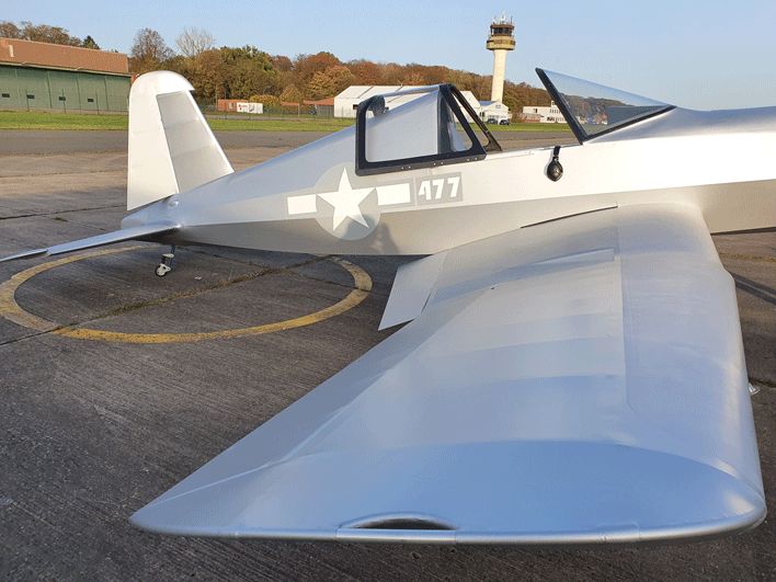 The max. horizontal speed of 55 kt could be achieved through wing changes, replica landing gear doors (see left photo) and an adapted propeller.